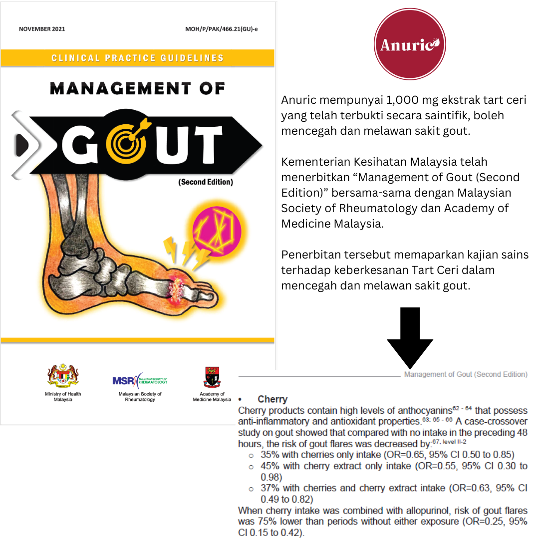 Formulasi Anuric untuk mencegah dan melawan sakit gout adalah berdasarkan beberapa kajian sains dan penerbitan oleh Kementerian Kesihatan Malaysia.